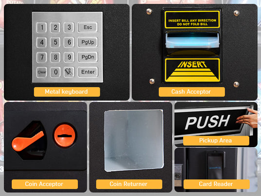 Accepts cash ($1, $5, $10, $20, $50, $100), coins, and credit/debit cards via secure card reader.Coin Changer (CC6100): Supports US Coins: $0.05, $0.10, $0.25, $1,Card Reader (WizarPOS): Accepts Visa, Mastercard, Amex, Discover, JCB, plus Apple Pay and Google Pay